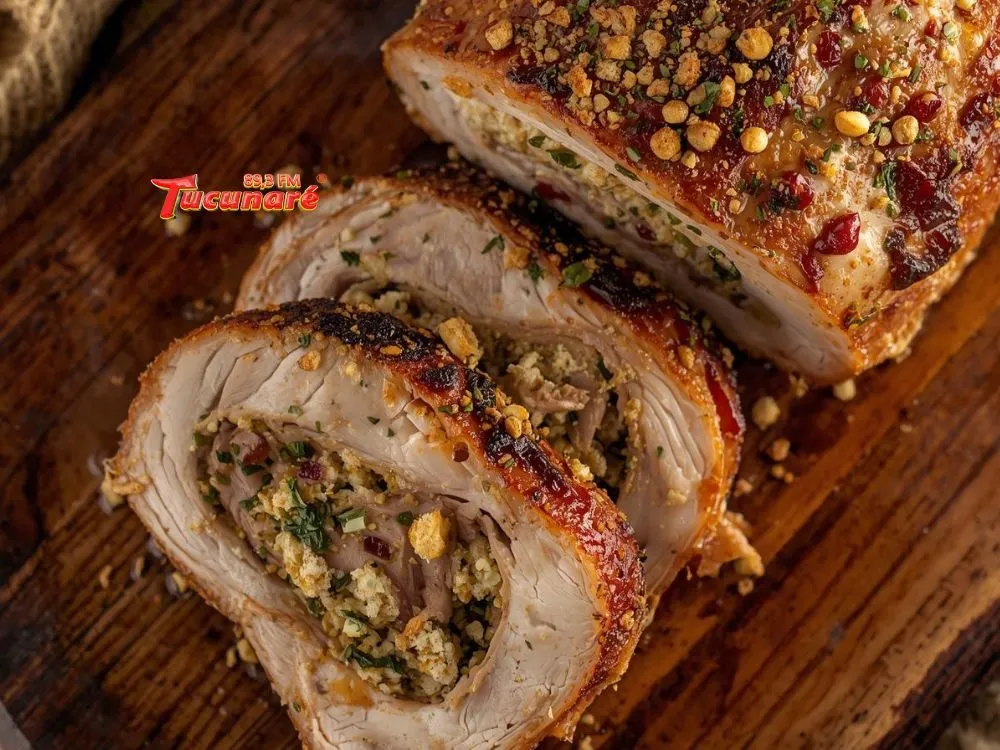 Lombo suíno recheado Ingredientes 1 lombo suíno Alho, sal, pimenta Cenoura em tiras Linguiça ou bacon Limão ou vinho Modo de preparoAbra o lombo, tempere,