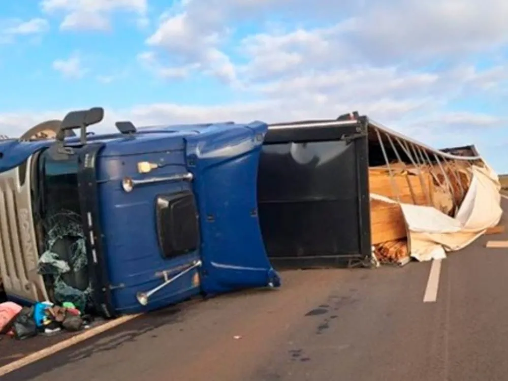 Uma carreta Scania/G 420, com placas de Juara (MT), carregada com madeira, tombou na manhã desta quinta-feira, 25 de setembro, no km 485 da Rodovia