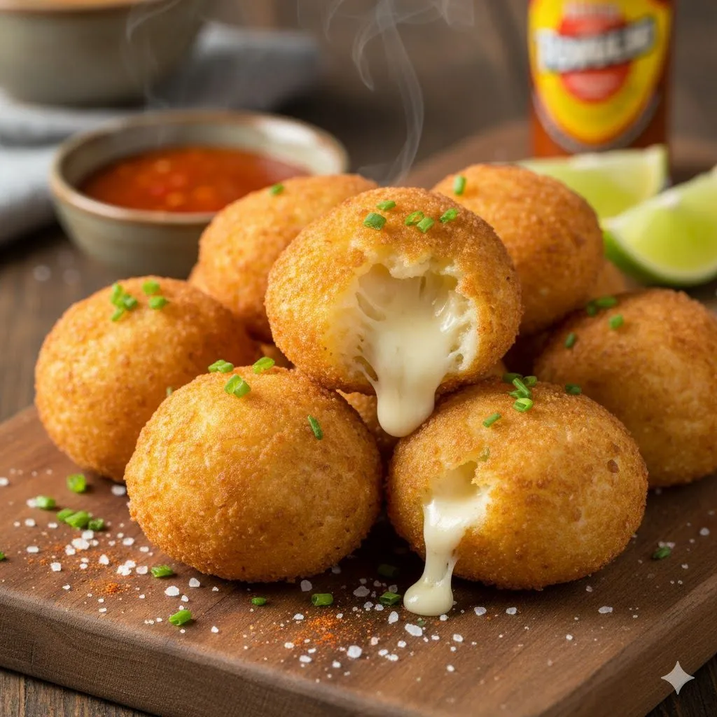 Faça bolinhas, recheie com queijo e passe na farinha.