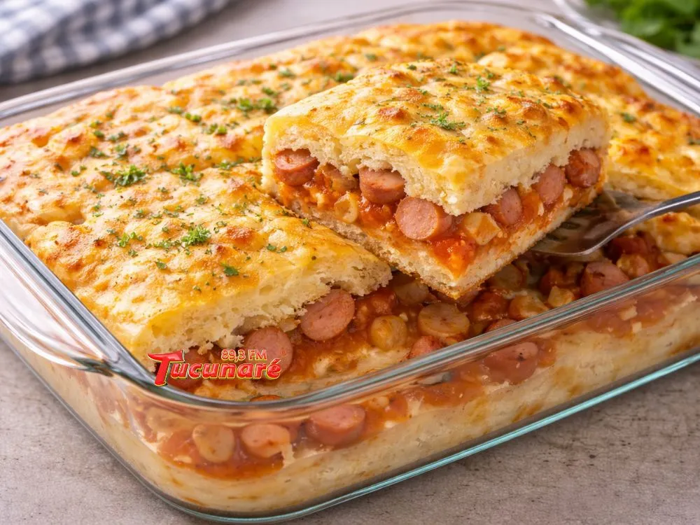 Espalhe as salsichas, a cebola e o molho.