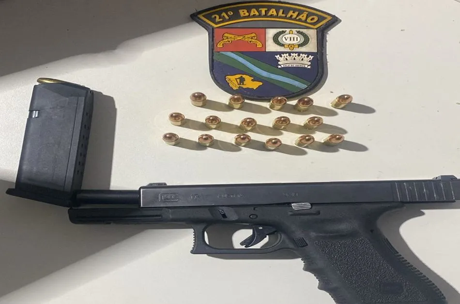 Durante a revista pessoal nos ocupantes e a busca no interior do veículo, os policiais localizaram uma pistola Glock 9x19mm, de origem austríaca, com a numeração suprimida.